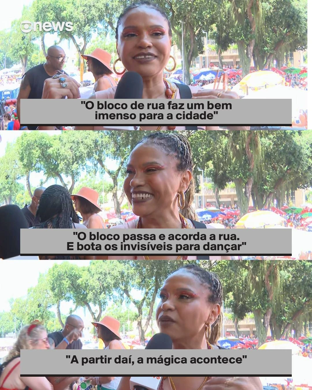 Teresa Cristina participou do Cordão do Boitatá, neste domingo (15) de carnaval, no Centro do Rio. Em entrevista à repórter Marcelly Setúbal, a cantora falou da importância dos blocos para as cidades e da festa democrática e inclusiva.