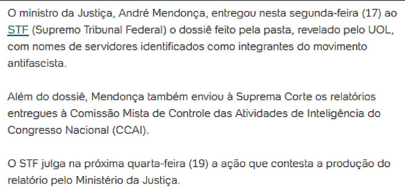 Olha o nível do atual ministro do STF...veja...quem ataca antifascista é o que mesmo? E houve crime com exposição de cidadãos brasileiros. E o STF definiu que arapongagem é crime...