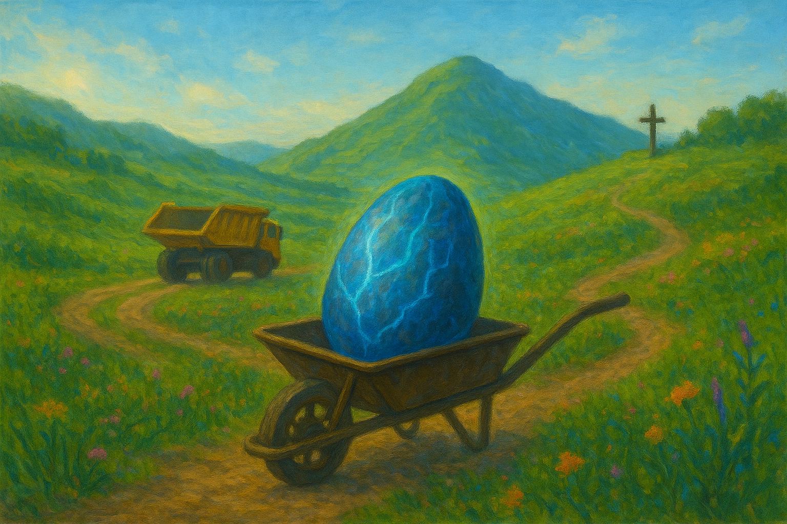 Meses depois, a cruz de madeira ergueu-se no alto da montanha. Uma igreja nasceu, e o sino da torre badalava com força. Polida, reluzente, foi colocada no altar entre dois anjos, tornando-se a pia batismal que receberia a água e o choro das crianças, guardando memórias e esperanças no fundo de sua alma de rocha.