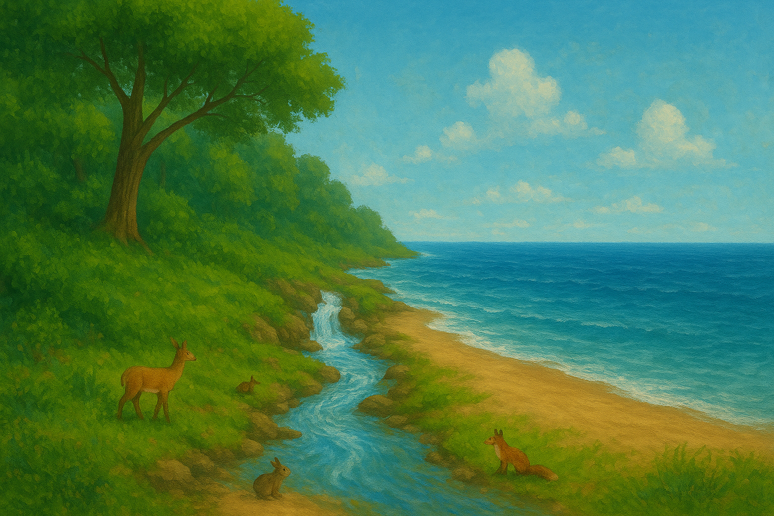 Ao chegar à areia, o sol era intenso e seu líquido cristalino se turvou, misturado à terra, à poluição e à pressa. Desesperado, correu em direção ao sonhado arquétipo. Uma onda veio ao seu encontro e o envolveu num abraço firme e salgado. O rio, assustado, se deixou levar. Misturou-se à maré profunda, sentiu o gosto do sal, das embarcações, a densidade do oceano, o poder que antes lhe parecia inalcançável.